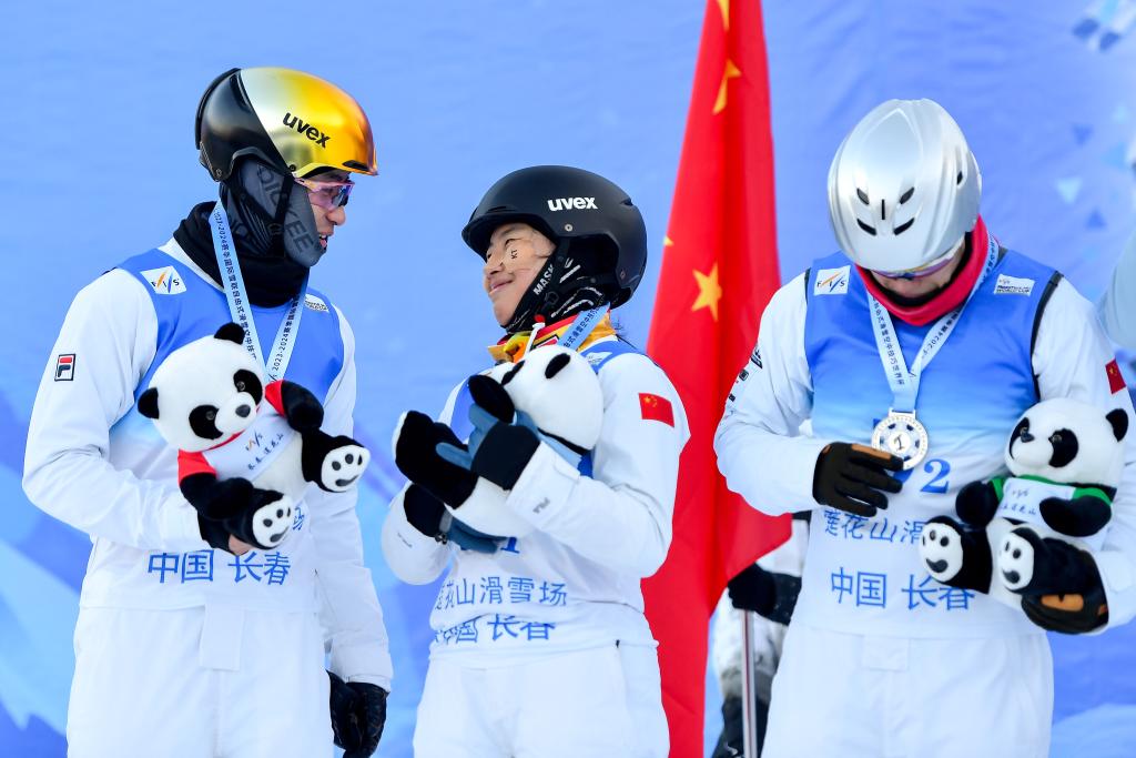12月17日,獲得亞軍的中國二隊選手陳梅婷(中)、王心迪(右)和李天馬在頒獎儀式上。當日,2023-2024賽季國際雪聯(lián)自由式滑雪空中技巧世界杯(中國長春分站賽)男女混合團體決賽在吉林長春蓮花山滑雪場舉行。新華社記者 許暢 攝
