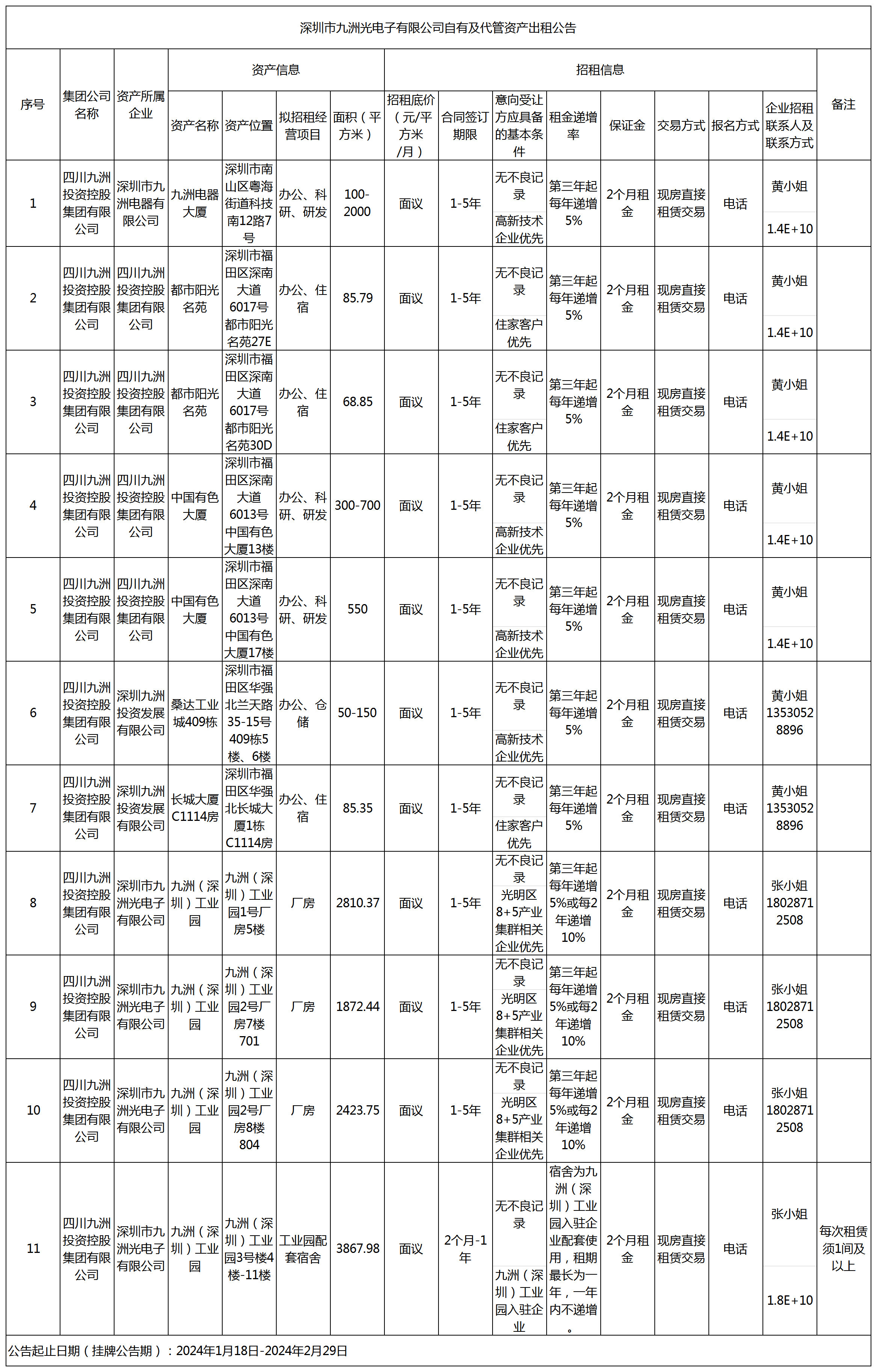 深圳市九洲光電子有限公司自有及代管資產(chǎn)出租公告