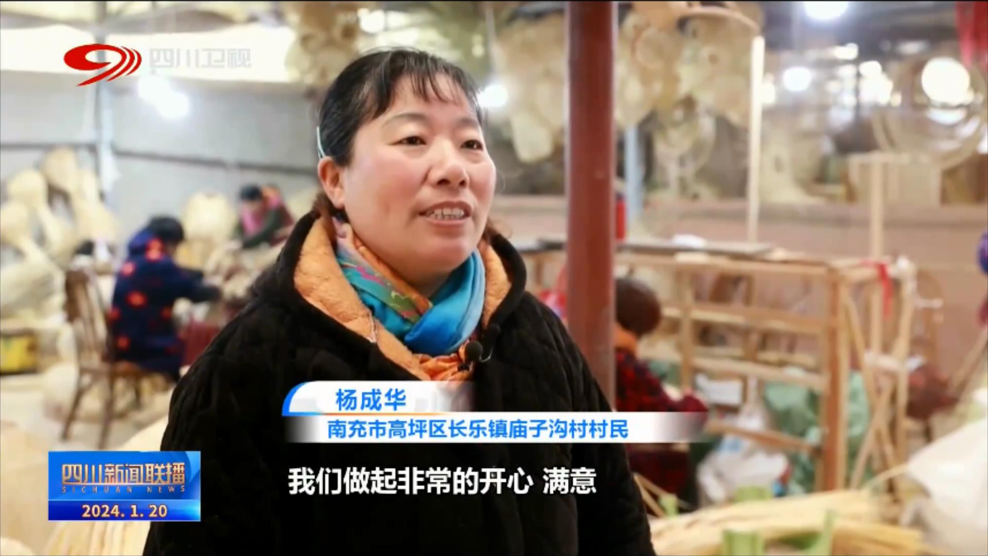 南充市高坪區(qū)長樂鎮(zhèn)廟子溝村村民 楊成華:工資一個(gè)月有三千多至四千,我們做起非常的開心、滿意。在廠頭可以編,在家里也可以編,老人小孩都照看了。