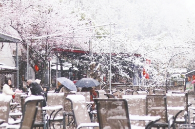 在三臺潼川古鎮(zhèn),人們在戶外賞雪。 (三臺融媒記者 李春梅 唐云峰 攝)