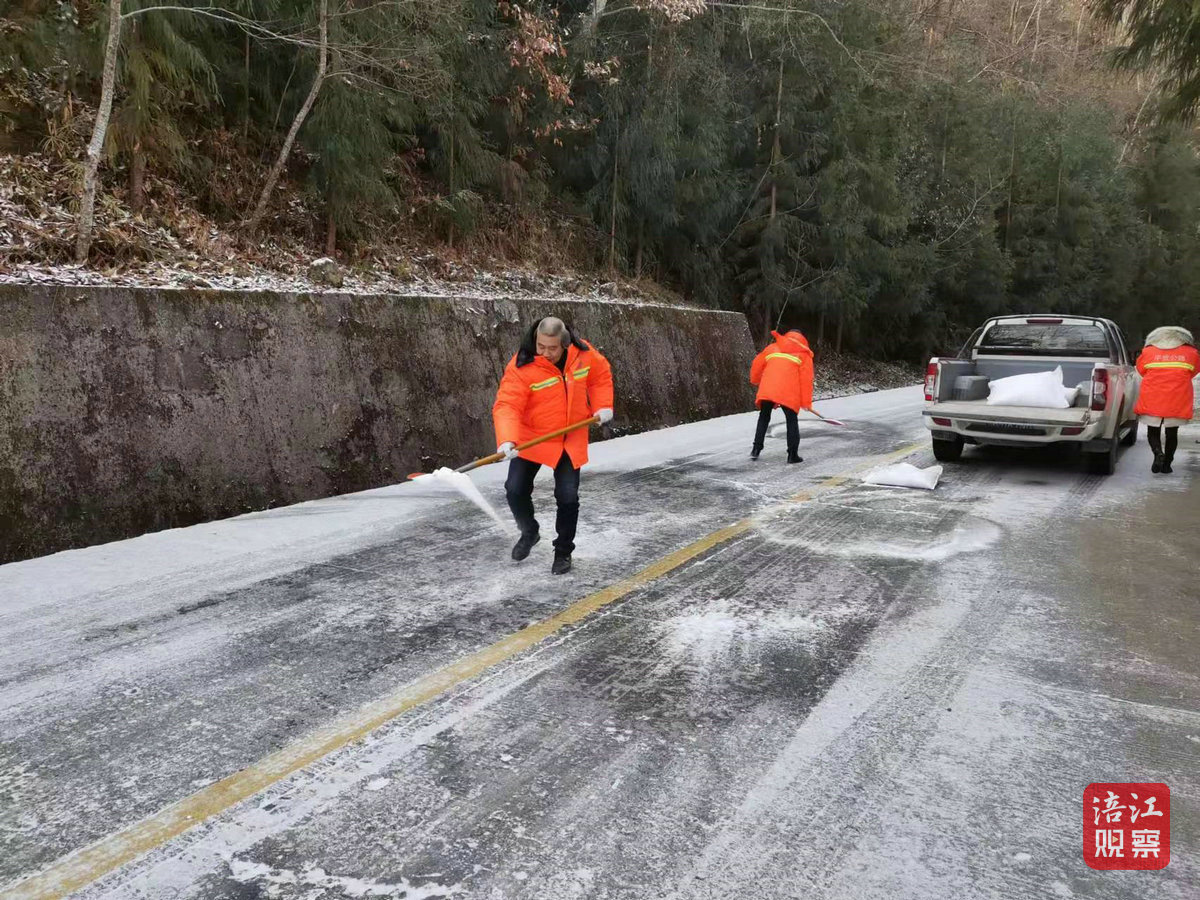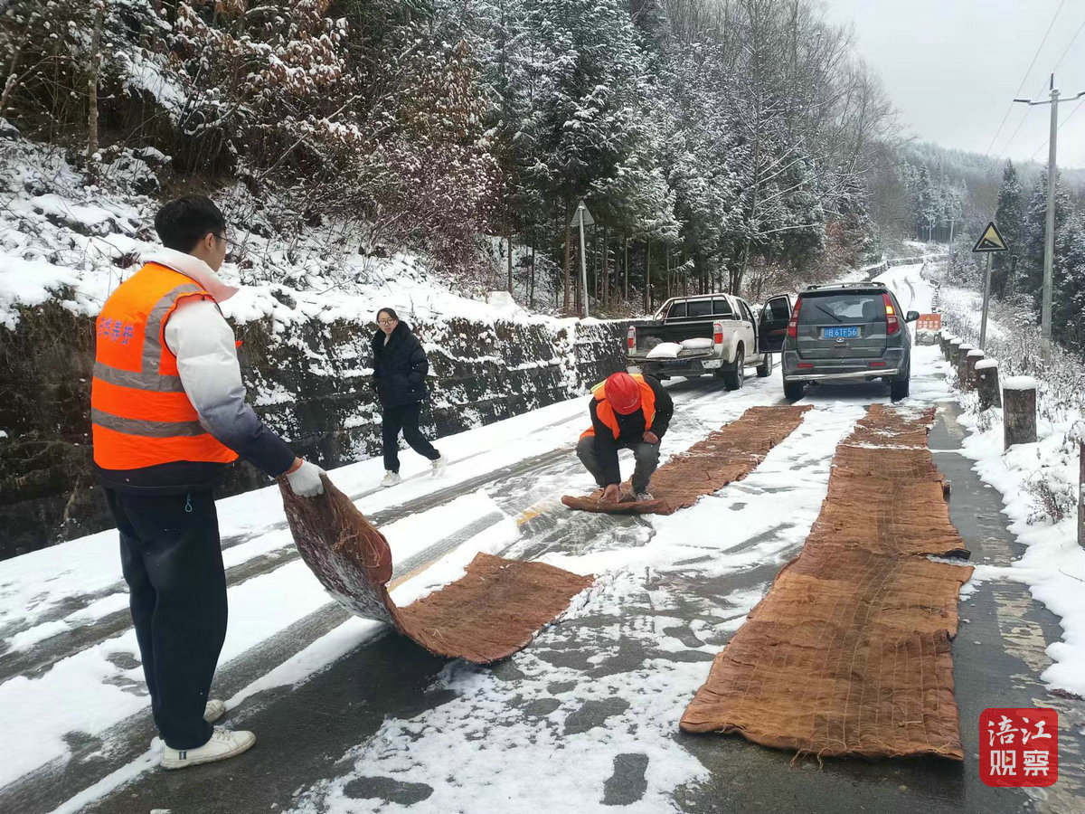 1月24日上午,在北川都貫-開坪公路上,公路養(yǎng)護人員為道路危險易滑路段撒融雪劑、鋪設(shè)防滑棕墊、設(shè)置交通標(biāo)志牌,與交警一同勸返車輛。