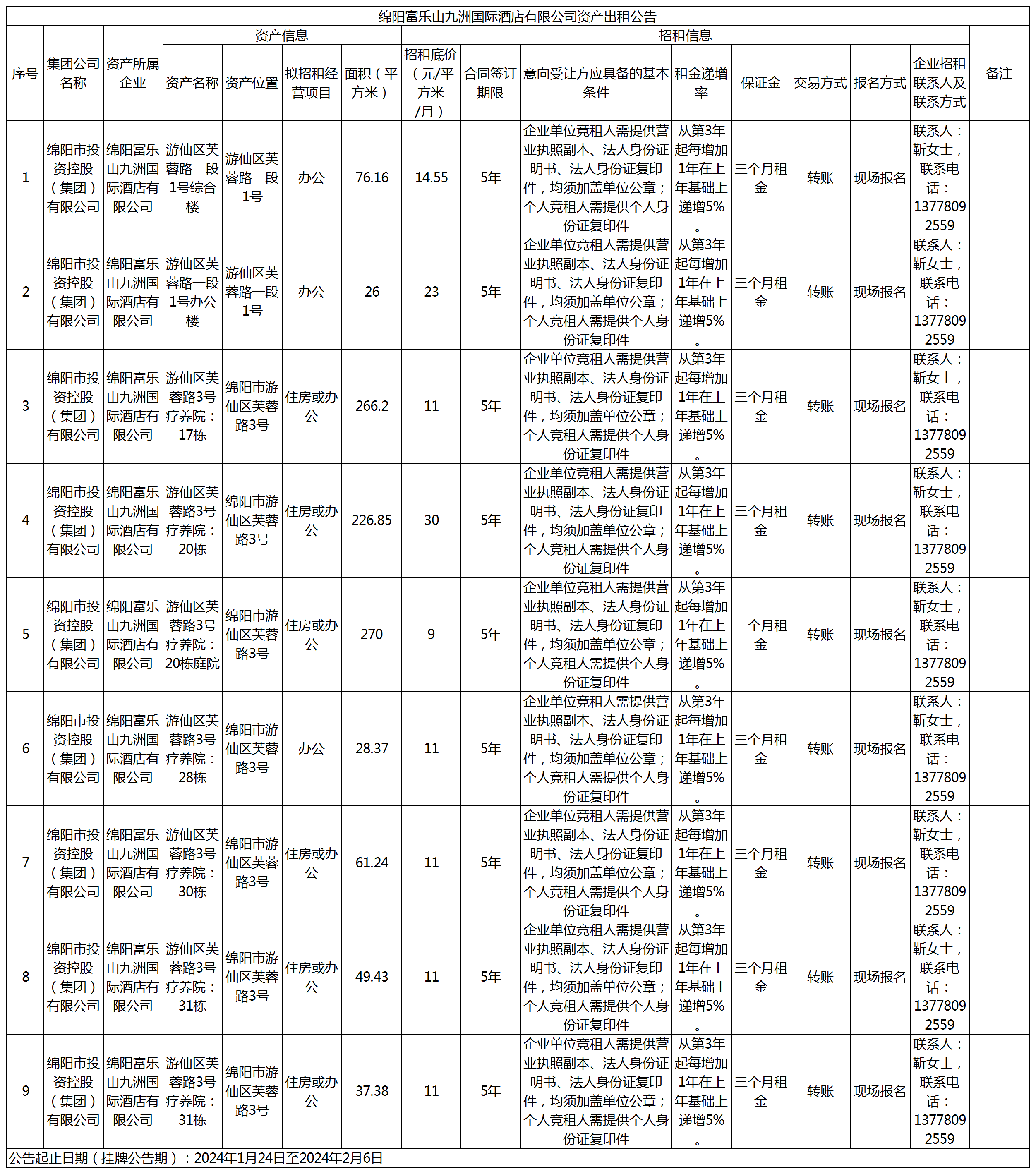 綿陽富樂山九洲國際酒店有限公司資產(chǎn)出租公告