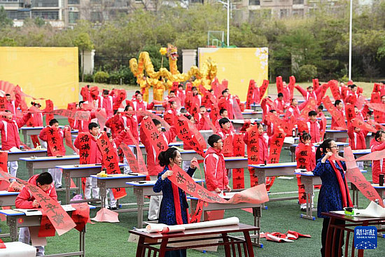 當(dāng)日,江西省贛州市文清路小學(xué)舉行師生集體寫春聯(lián)迎新春活動,學(xué)校師生在操場上揮毫潑墨,書寫春聯(lián),迎接新春佳節(jié)。