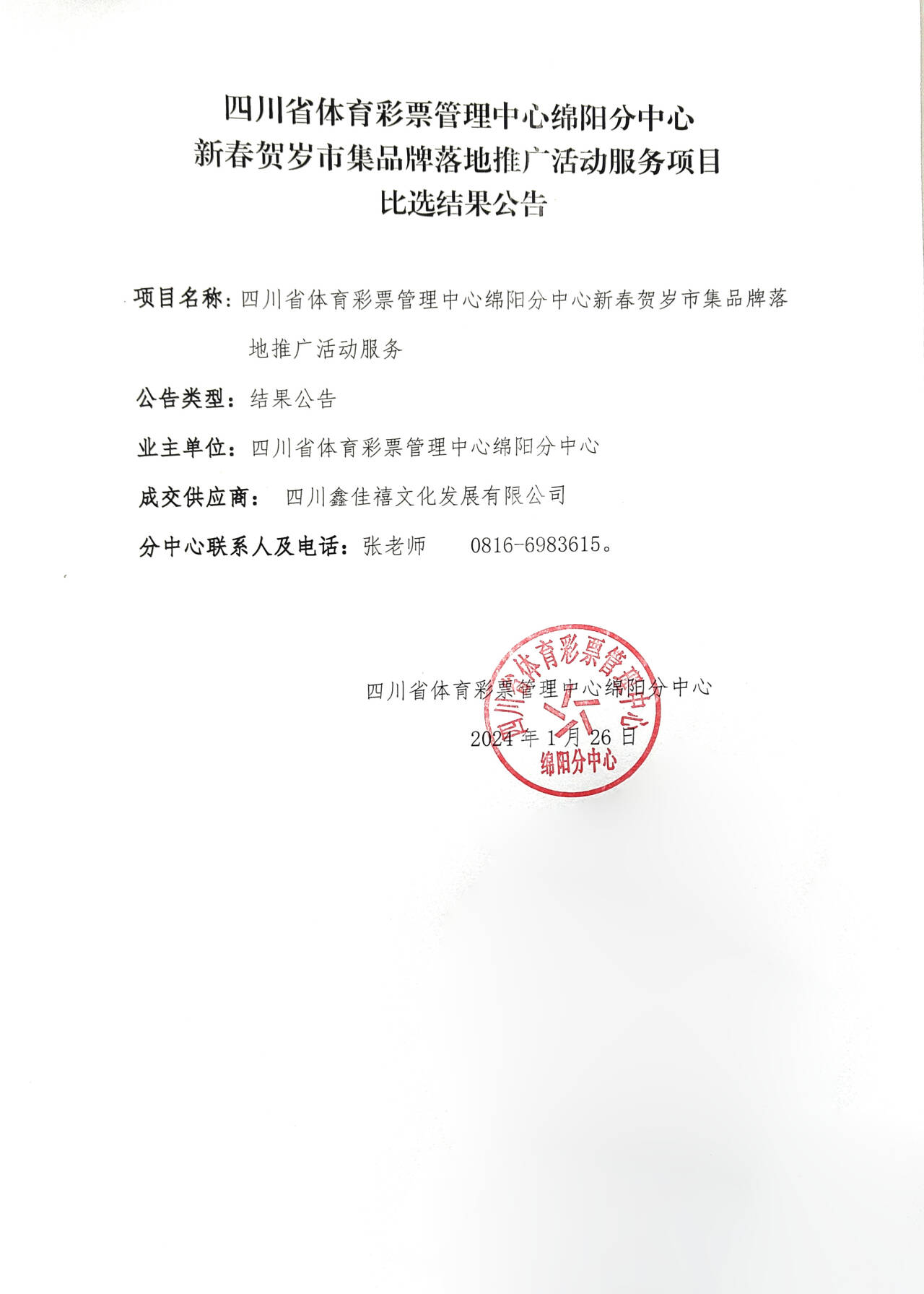 四川省體育彩票管理中心綿陽(yáng)分中心新春賀歲市集品牌落地推廣活動(dòng)服務(wù)項(xiàng)目比選結(jié)果公告