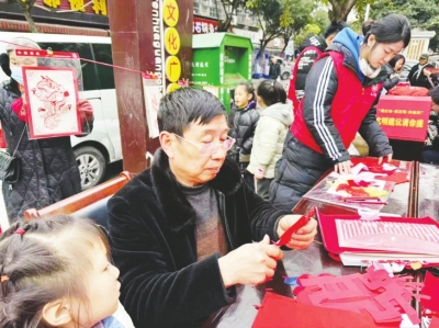 江油剪紙藝人在現(xiàn)場開展剪紙教學,引來不少居民參與,現(xiàn)場洋溢著歡樂的氛圍。剪紙非遺傳承人倪忠甫說:“今年是龍年,我特意創(chuàng)作了一系列以龍為題材的剪紙作品,祝愿大家龍年大吉、萬事如意,祝愿祖國繁榮昌盛!”