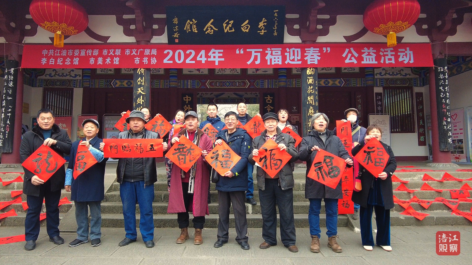 在江油市李白紀念館前廣場,江油市委宣傳部組織“萬福迎春”贈寫春聯(lián)公益活動,向市民送出新春的美好祝福。