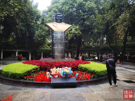 鄧稼先廣場上,不少市民在這里跳舞。結(jié)束后,大家會把器具收拾好再離開,現(xiàn)場沒有留下任何垃圾;還有市民自發(fā)在鄧稼先塑像前擺放鮮花和紅旗,以表紀(jì)念。
