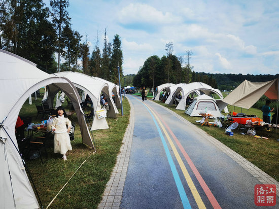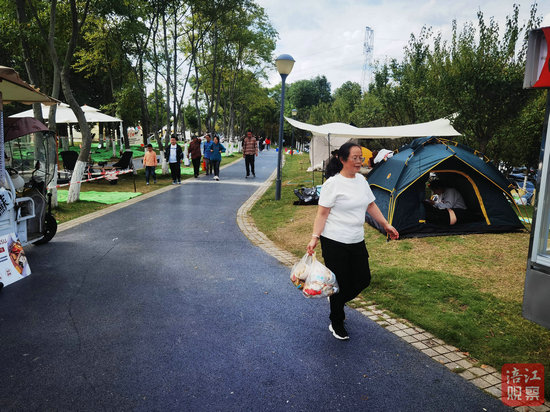 在八家堰濕地公園,大面積的草地和健身步道吸引了眾多近郊游的市民。記者看到,在濕地公園內(nèi),布滿了各式各樣的帳篷,市民在這里野炊、休閑,盡情感受安昌江畔的美麗景色。
