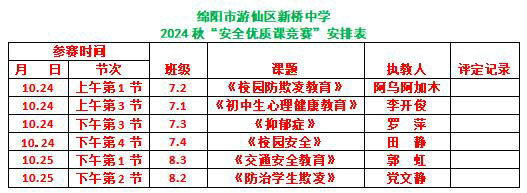 綿陽(yáng)新聞網(wǎng)訊 為了認(rèn)真落實(shí)《綿陽(yáng)市游仙區(qū)教育體育局關(guān)于開展2024年中小學(xué)(幼兒園)安全教育優(yōu)質(zhì)課競(jìng)賽活動(dòng)的通知》相關(guān)工作安排,推動(dòng)學(xué)校安全教育課程建設(shè),展示新時(shí)代安全教育教師隊(duì)伍的綜合素質(zhì),提高師生珍愛(ài)生命意識(shí),促進(jìn)教師專業(yè)成長(zhǎng),10月24日至10月25日,游仙區(qū)新橋中學(xué)開展了以“立足安全課堂 聚焦核心素養(yǎng)?”為主題的2024年秋安全優(yōu)質(zhì)課競(jìng)賽【推選】活動(dòng)。