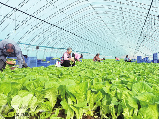 在該鎮(zhèn)高棚村蔬菜現(xiàn)代農(nóng)業(yè)園區(qū),當(dāng)?shù)夭宿r(nóng)穿梭在田間,忙著收割小白菜。經(jīng)過(guò)分揀、裝箱、過(guò)秤、打包、裝車,這些蔬菜很快將出現(xiàn)在千里之外的超市、農(nóng)貿(mào)市場(chǎng)和餐桌上。