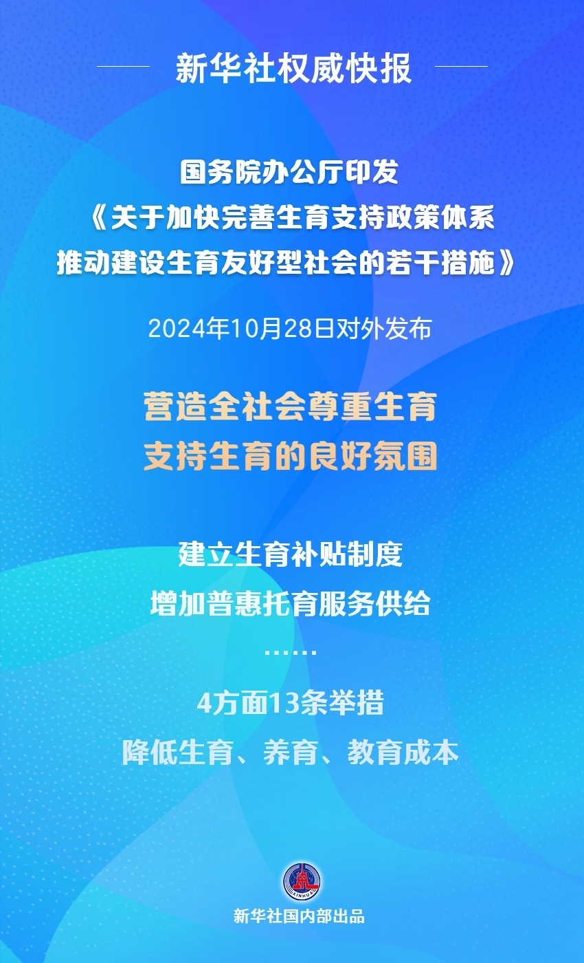 國務(wù)院辦公廳印發(fā)的《關(guān)于加快完善生育支持政策體系推動建設(shè)生育友好型社會的若干措施》2024年10月28日對外發(fā)布。