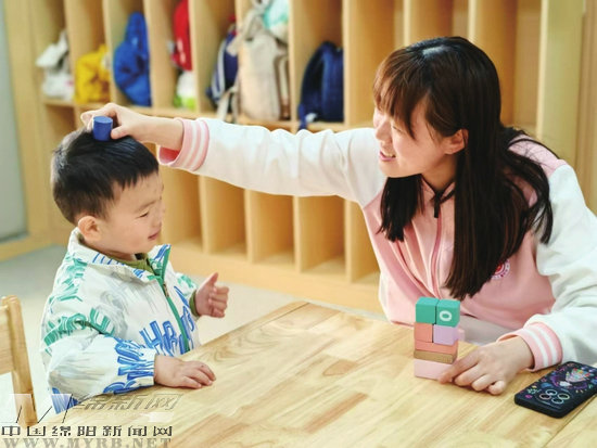 走進(jìn)托育中心,遠(yuǎn)遠(yuǎn)就聽見孩子們的歡笑聲。封閉式院落里,寬敞的戶外活動(dòng)場(chǎng),幼兒老師正帶領(lǐng)孩子們做游戲;教室里,中班的孩子在老師手把手教導(dǎo)下玩弄各種拼圖、積木;樓上休息室里,保育員正為午睡醒來小班寶寶穿衣服……