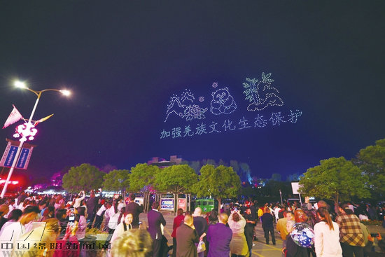 當晚,在禹王橋至南橋安昌河空域,一千臺無人機同時升空,為現(xiàn)場游客帶來了一場科技與藝術完美融合的視覺盛宴。“走北川·過羌年”、“篝火+萬人沙朗”、“大禹故里·中國羌城”、“熊貓”等圖形和字樣不斷變化,各種美輪美奐的圖案閃耀璀璨、光彩奪目,與安昌河畔的夜景相得益彰,吸引大量市民游客駐足觀賞,拍照打卡。此次無人機表演精心安排了17組精美絕倫的造型表演,融合羌族特色元素,多維度、多角度地展示通航前沿技術。這場盛大的無人機燈光秀也是北川低空經濟蓬勃發(fā)展的生動展現(xiàn)。