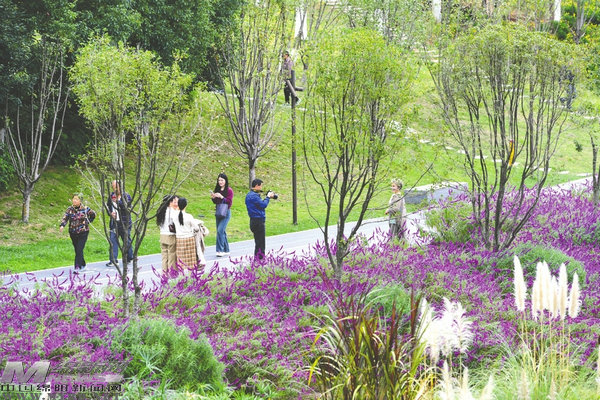 秋季里的綿陽科技城人才公園,色彩斑斕,景美如畫,紅的、黃的、紫的、白的……各種色彩交織在一起,與碧綠的湖水相映成趣,構(gòu)成了一幅絢麗迷人的秋日畫卷,吸引許多市民游客漫步園中,欣賞家門口的“醉”美秋色。