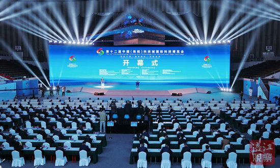 ?。保皶r55分許,劉曉峰宣布:第十二屆中國(綿陽)科技城國際科技博覽會開幕。