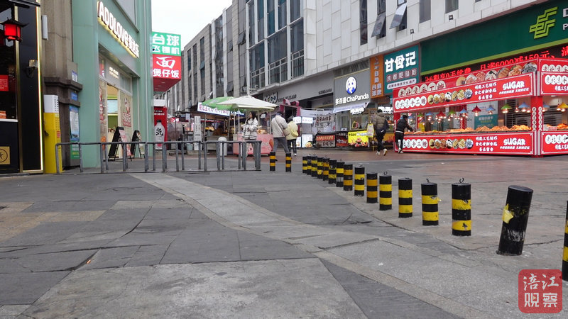 隨后,記者來(lái)到涪城區(qū)萬(wàn)達(dá)廣場(chǎng)美食街入口的人行道處,這里設(shè)置了密密麻麻的擋車(chē)立柱,同時(shí)還有不銹鋼護(hù)欄。記者用鞋子丈量后發(fā)現(xiàn),其間距竟然不足40厘米。這樣狹窄的距離,對(duì)于推嬰兒車(chē)的市民來(lái)說(shuō),無(wú)疑是一道難以逾越的障礙。
