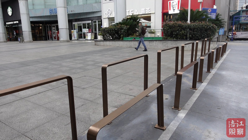 與之形成鮮明對(duì)比的是涪城區(qū)凱德廣場(chǎng)。這里設(shè)置的是金色不銹鋼U型護(hù)欄擋車(chē)器,其U型開(kāi)口寬度約為80厘米,足以讓各類(lèi)推車(chē)順利通過(guò)。記者在現(xiàn)場(chǎng)觀察到,推車(chē)的市民能夠順利通行,絲毫沒(méi)有受到阻礙,同時(shí)也有效地?cái)r住了非機(jī)動(dòng)車(chē),避免其駛?cè)霃V場(chǎng)。