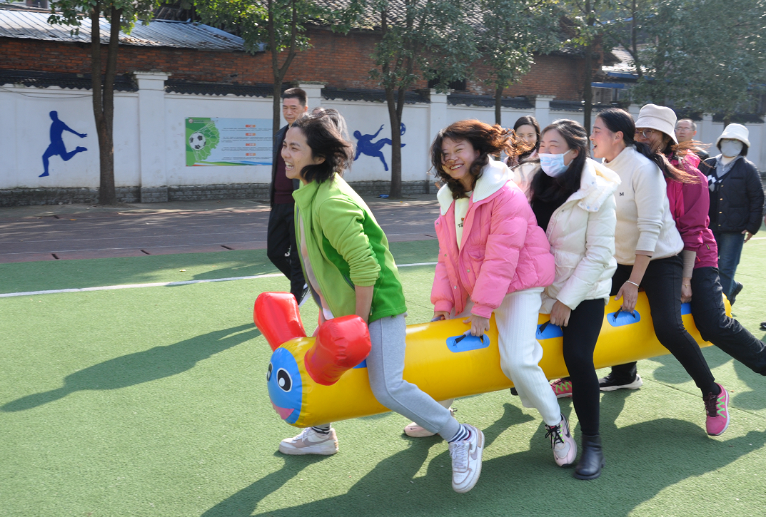 本次趣味運(yùn)動會共設(shè)6個小組,每個小組由15—16名教職工組成。設(shè)置了定點(diǎn)投籃、毛毛蟲接力賽、同心鼓顛球和面粉接力賽等多個妙趣橫生的趣味項目。“定點(diǎn)投籃”中,老師們各顯身手,展示著自己的嫻熟投籃技巧。籃球在空中劃過一道道優(yōu)美的弧線,每一次命中都贏得陣陣歡呼。“毛毛蟲接力賽”更是考驗著老師們之間的默契配合,大家齊喊口令,蹦蹦跳跳地向前沖,齊心協(xié)力向終點(diǎn)邁進(jìn)。有的隊伍步伐一致,快速前行;有的隊伍雖略顯慌亂,但也在相互鼓勵中堅持到底。在“同心鼓顛球”比賽中,老師們團(tuán)結(jié)一致,使出渾身解數(shù),竭力使羊皮鼓上的排球不掉落,讓大家充分體會到了團(tuán)結(jié)協(xié)作的重要性。“面粉接力賽”中,老師們根據(jù)比賽需要設(shè)計制作了樣式各異的運(yùn)面粉工具,隨著比賽總指揮王剛的一聲令下,老師們立即化身為可愛的面粉搬運(yùn)工,那粘有面粉的模樣既滑稽又充滿活力。他們爭分奪秒,為團(tuán)隊的榮譽(yù)奮力拼搏,每一次運(yùn)送都飽含著激情與活力。
