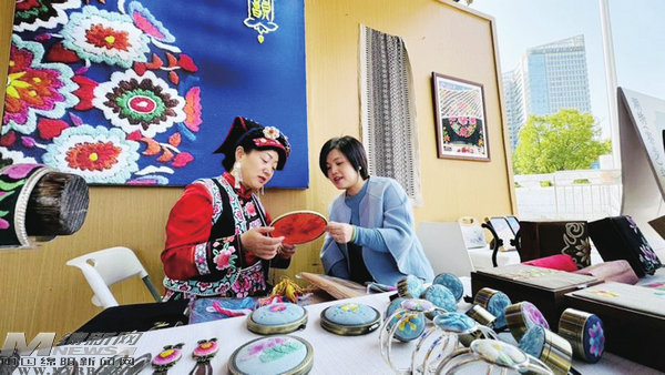 羌族傳統(tǒng)刺繡工藝傳承人陳云珍(左)和廣東省東莞市潮繡(寮步)代表性傳承人蔡小蘋在“切磋技藝”。