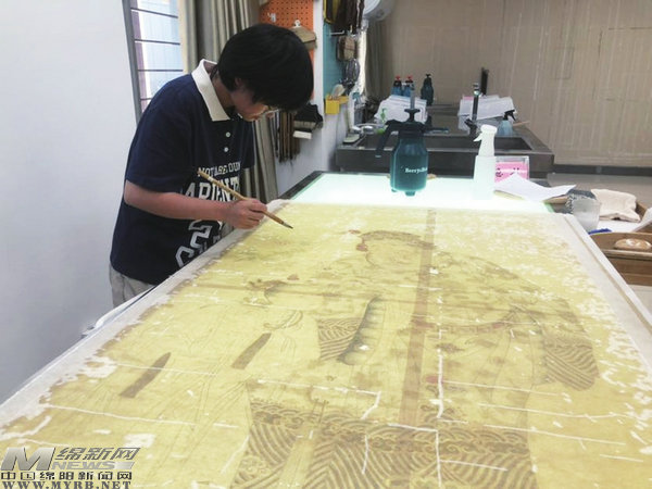 “已經(jīng)習(xí)慣了,隱補(bǔ)需要的就是靜心和耐心。”胥敏告訴記者,破舊古畫往往因蟲蛀等原因出現(xiàn)大小不同的殘洞,需要選擇材質(zhì)、厚度相宜的補(bǔ)料進(jìn)行補(bǔ)配。補(bǔ)缺前先沿缺損邊沿輕輕刮出0.1—0.2厘米的坡度,以毛筆涂抹薄漿,將補(bǔ)絹(紙)對(duì)準(zhǔn)簾紋平放在缺損處,墊紙按實(shí),趁濕刮去多余部分。