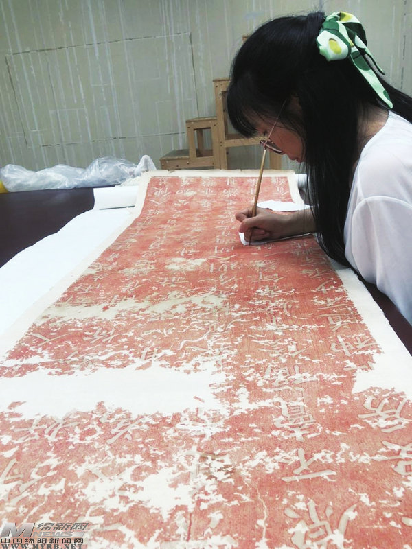 長(zhǎng)發(fā)披肩的王靜握著一支小號(hào)毛筆,正低頭對(duì)案桌上一幅胡雪海的楷書拓片一點(diǎn)點(diǎn)描補(bǔ)。這幅長(zhǎng)卷拓片紅底白字,有的字跡已斑駁模糊,有的詞句已完全斷字脫節(jié)。她輕輕用筆尖醮上紅色顏料,再在紅色背底殘缺的地方小心補(bǔ)全。
