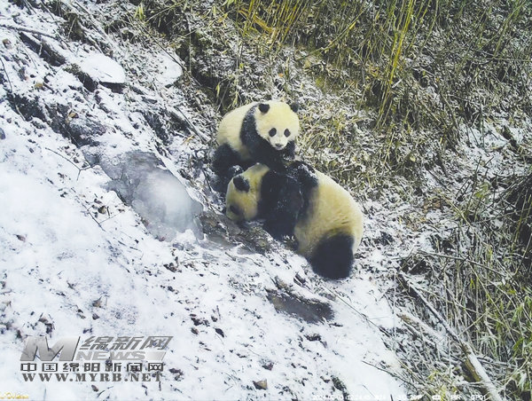 綿陽(yáng)新聞網(wǎng)訊 近日,平武縣木座藏族鄉(xiāng)和平村巡護(hù)隊(duì)員在整理紅外相機(jī)拍到的素材時(shí),發(fā)現(xiàn)了兩只野生大熊貓?jiān)谘┑乩锘顒?dòng)的畫面。
