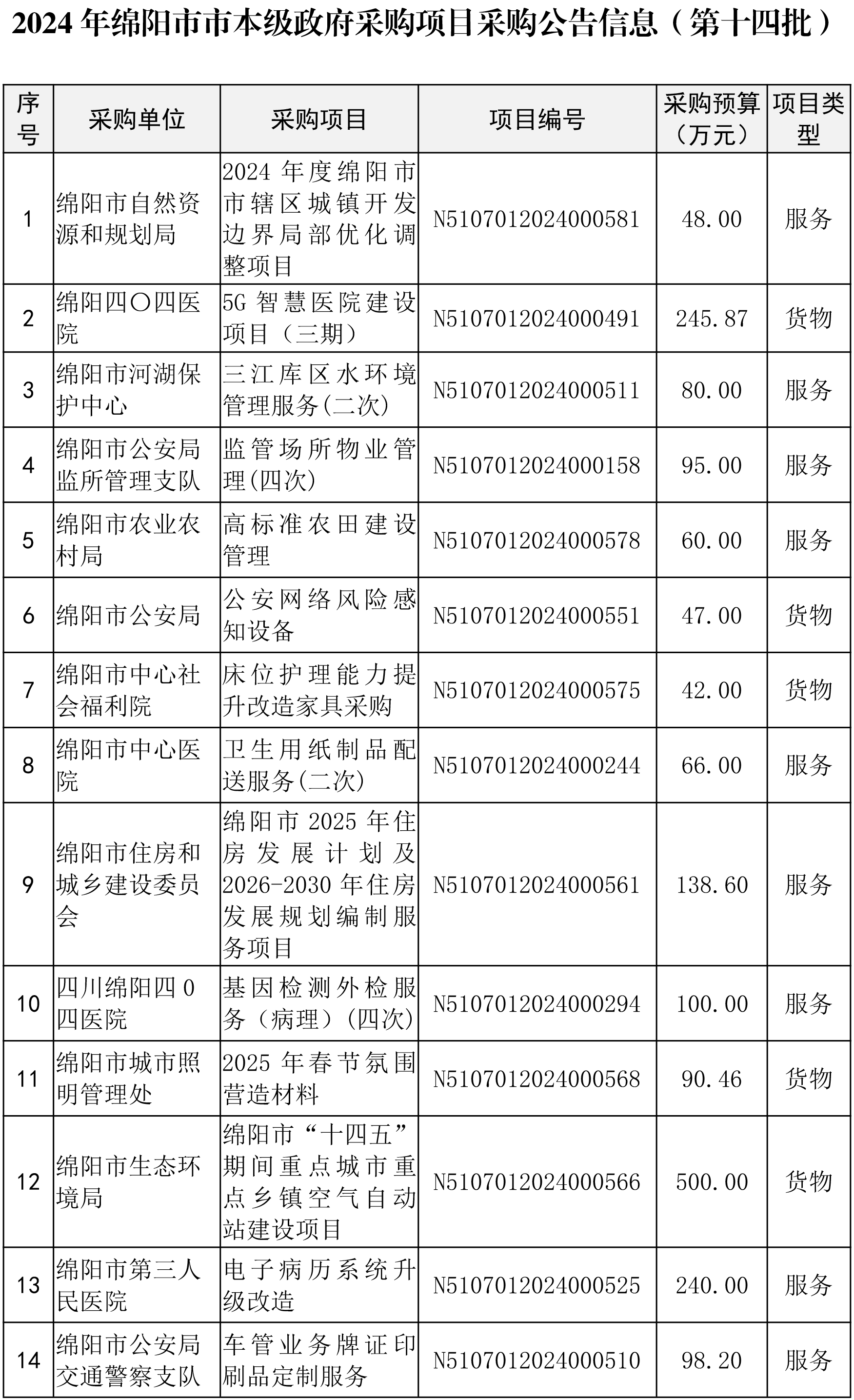 此批綿陽市市本級政府采購項(xiàng)目集中發(fā)布采購公告信息共計(jì)20個(gè)(于12月23日前已掛網(wǎng)),采購預(yù)算金額5512.55萬元,其中:貨物類項(xiàng)目10個(gè),金額4553.75萬元;服務(wù)類項(xiàng)目10個(gè),金額958.8萬元。