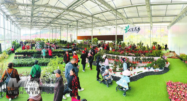 游客在七里花鄉(xiāng)參觀室內(nèi)花卉