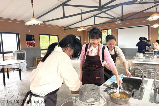游客在花韻詠盛研學(xué)旅行綜合實(shí)踐基地體驗(yàn)農(nóng)耕文化項(xiàng)目