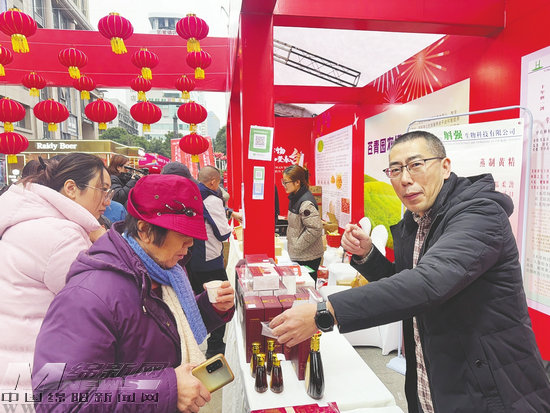 展會現(xiàn)場人頭攢動,琳瑯滿目的產(chǎn)品吸引了眾多市民駐足詢問、購買。泥鰍干、醬腌菜、柑霸王果凍橙……飄香的農(nóng)特產(chǎn)品攤位前圍滿參觀者,在攤主的熱情邀請下大家紛紛動嘴品嘗,大快朵頤之余慷慨購買,紅紅火火的交易景象,飄蕩著濃濃的年味兒。