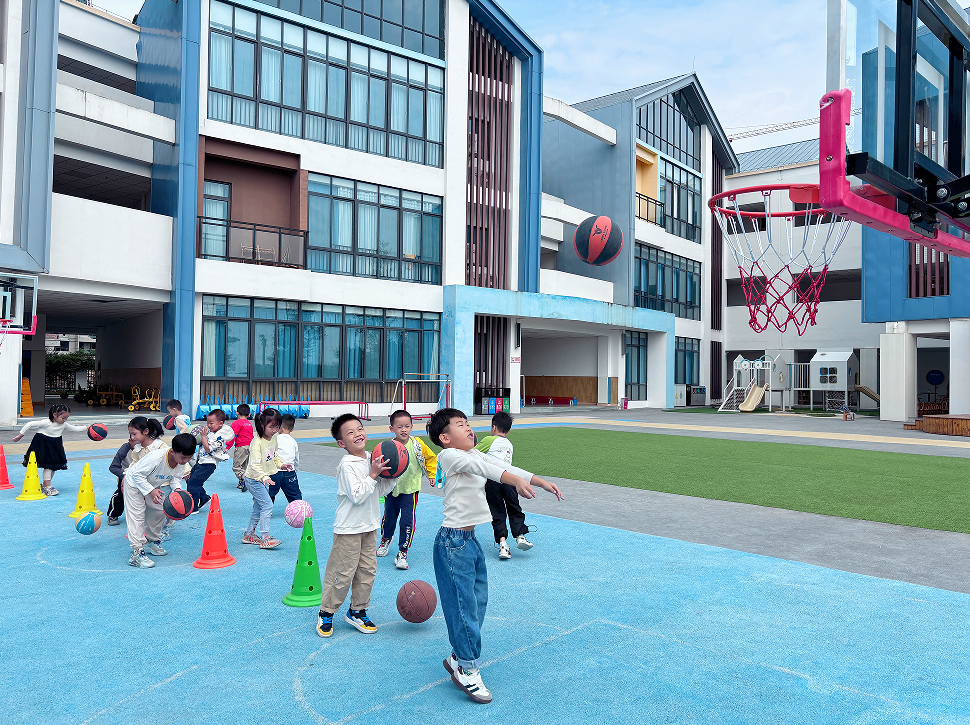 籃球運(yùn)動(dòng)涵蓋了走、跑、跳、投等多種身體運(yùn)動(dòng)形式,能全面、有效、綜合促進(jìn)身體素質(zhì)發(fā)展。老師以游戲的形式開展活動(dòng),重點(diǎn)培養(yǎng)孩子們對(duì)籃球的探究興趣,豐富對(duì)籃球運(yùn)動(dòng)的動(dòng)作技能。隨著他們肢體控制能力增強(qiáng),籃球技術(shù)內(nèi)容教學(xué)比例逐漸增加,從拍球、傳球、投籃等基本的籃球技術(shù)練習(xí)到多種運(yùn)球、傳球、投籃技術(shù)學(xué)習(xí),從而加強(qiáng)規(guī)則意識(shí)、團(tuán)隊(duì)意識(shí)、競(jìng)爭(zhēng)意識(shí)的養(yǎng)成,培養(yǎng)他們速度、耐力、靈敏、協(xié)調(diào)性全面發(fā)展。