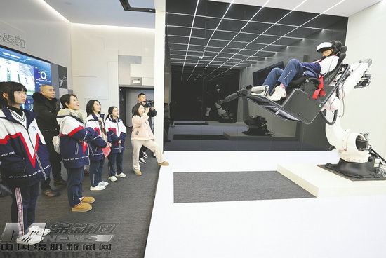 在中國(綿陽)科技城5G科技園,青年們現(xiàn)場體驗趣味交互項目:戴上VR眼鏡,坐在720°翻轉(zhuǎn)機械臂上徜徉虛擬世界,和智能機器人一起搖擺跳舞,沉浸式體驗MR技術(shù)。