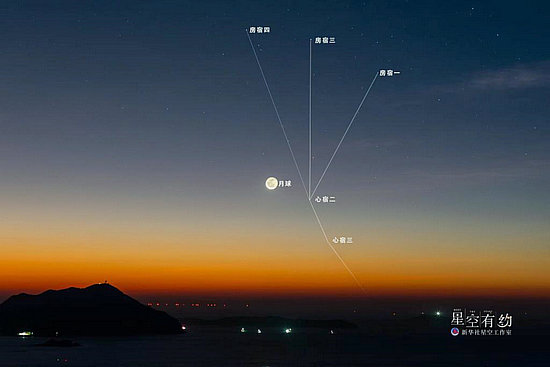 此次月掩心宿二時(shí),月相為農(nóng)歷臘月廿六的殘?jiān)?,不至于過于明亮而影響對(duì)心宿二的肉眼觀測;特別是掩終時(shí),心宿二再現(xiàn)的過程更容易觀測。而看不到掩星的地區(qū),在凌晨的東南方低空可以看到一彎殘?jiān)屡c微紅的心宿二近距離相依相伴的場景。