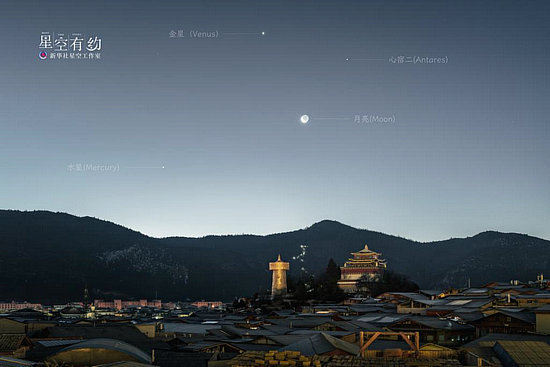 云南星空攝影愛好者張茂海2023年1月9日在云南迪慶拍制的金星、心宿二伴月。(本人供圖)