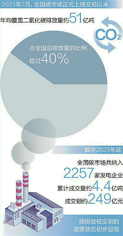 2021年7月全國(guó)碳市場(chǎng)正式上線(xiàn)交易以來(lái),運(yùn)行整體平穩(wěn),年均覆蓋二氧化碳排放量約51億噸,占全國(guó)總排放量的比例超過(guò)40%。截至2023年底,全國(guó)碳市場(chǎng)共納入2257家發(fā)電企業(yè),累計(jì)成交量約4.4億噸,成交額約249億元,碳排放權(quán)交易的政策效應(yīng)初步顯現(xiàn)。