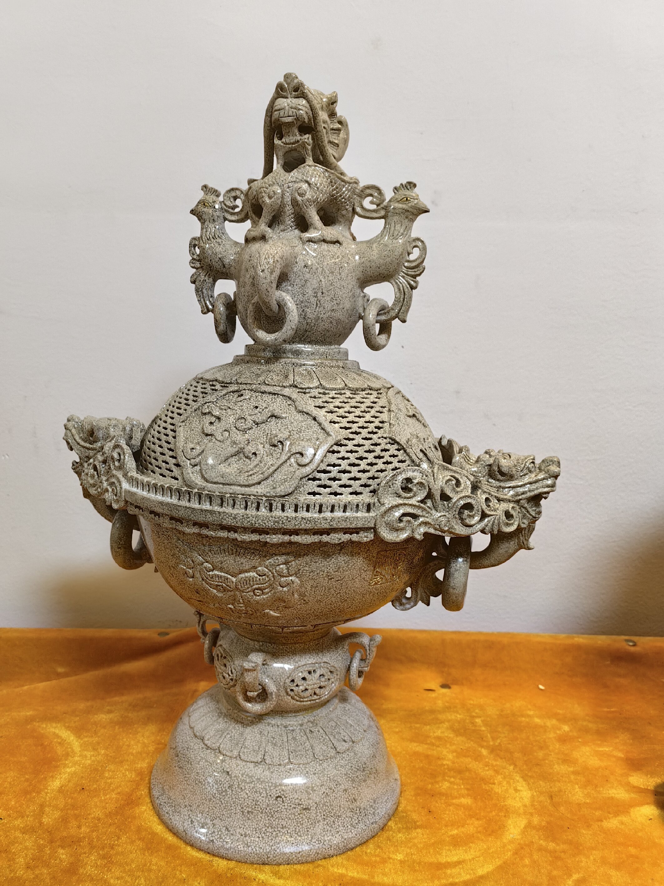 玉龍化石雕刻《龍鳳花熏》