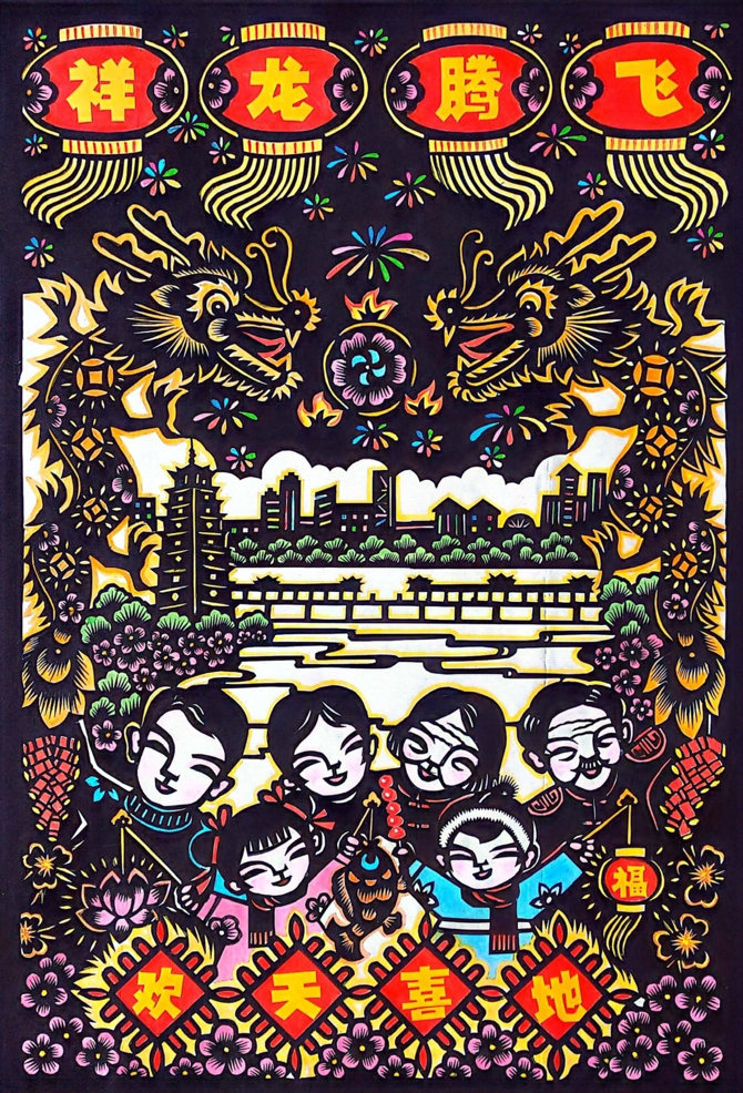 這件剪紙作品中,一對年輕的軍人夫婦乘著祥龍騰飛,一群和平鴿追隨祥龍而來。龍身以梅花和古錢幣裝扮,寓意人民子弟兵保家衛(wèi)國給人民帶來幸福和平與安寧。在畫面中,還有古建筑與現(xiàn)代城市群落交相輝映,勾勒出繁榮的社會景象。