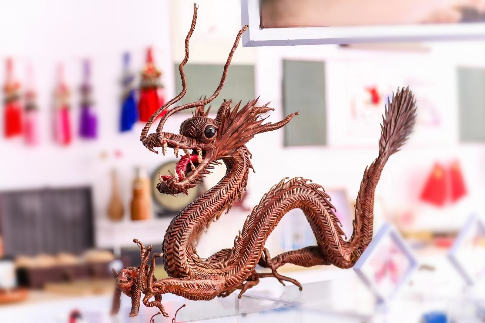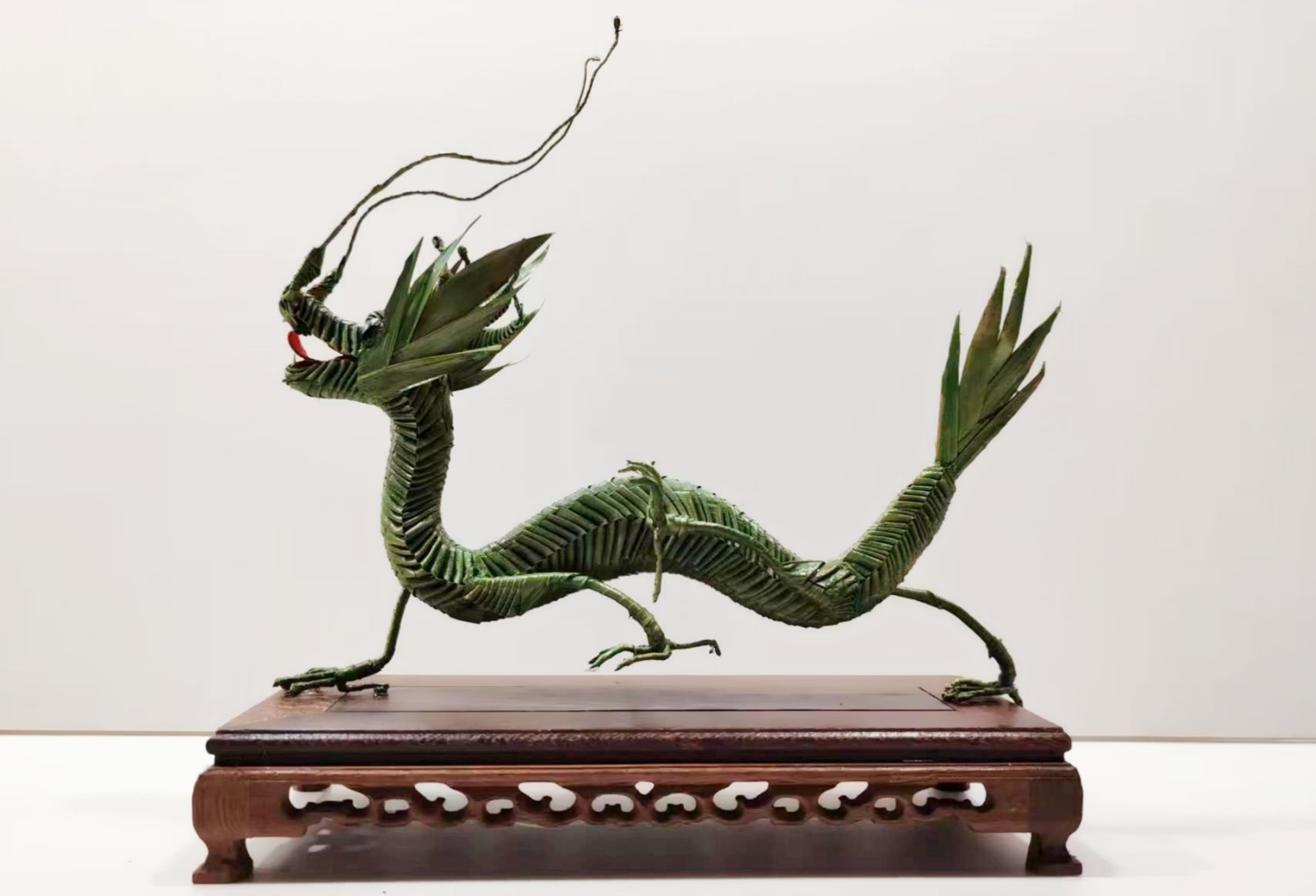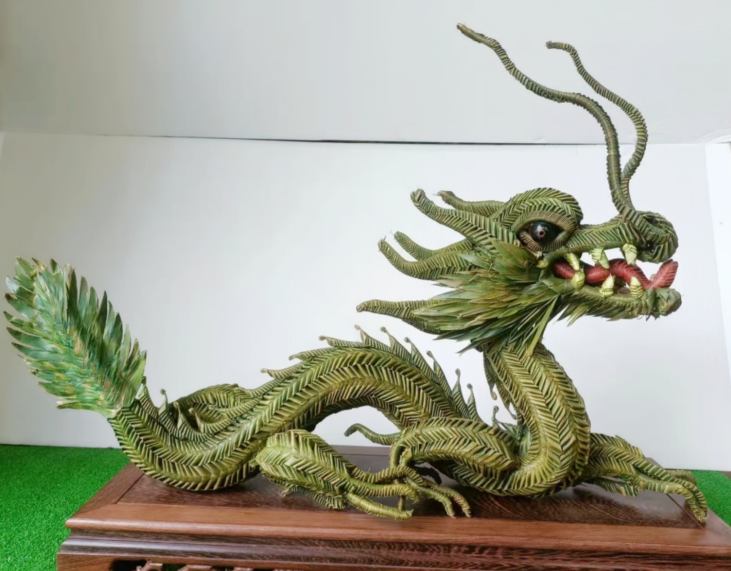 黃強從2004年開始學(xué)習(xí)羌族草編技藝,在繼承傳統(tǒng)技法的基礎(chǔ)上進(jìn)行工藝創(chuàng)新,結(jié)合人們的生活需求,研發(fā)草編草鞋以及生活飾品、擺件等,草編龍就是其中之一。近年來,他與團隊研發(fā)出不同規(guī)格、不同形態(tài)的草編中國龍,并多次帶出國門展示、展銷,受到世界各地友人的喜愛。