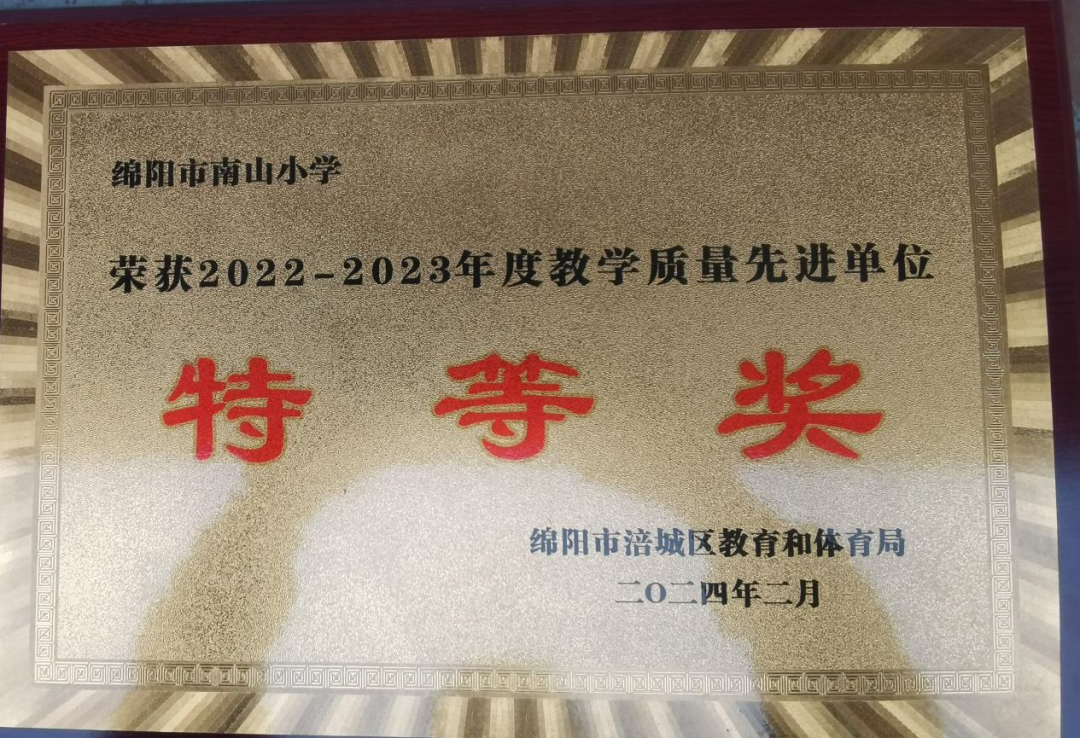 奮楫篤行,履踐致遠(yuǎn)。春華秋實,碩果芬芳。2024年2月19日,涪城區(qū)召開教育教學(xué)改革實驗區(qū)建設(shè)工作會暨2022—2023學(xué)年度學(xué)校教育質(zhì)量評價表彰大會上,綿陽市實驗小學(xué)南山校區(qū)繼2021—2022學(xué)年度榮獲涪城區(qū)學(xué)??冃Э己?、教學(xué)質(zhì)量特等獎后,繼續(xù)榮獲2022—2023學(xué)年度:教學(xué)質(zhì)量先進(jìn)單位特等獎、綜合績效考核先進(jìn)單位一等獎、畢業(yè)生就近入學(xué)先進(jìn)單位一等獎。