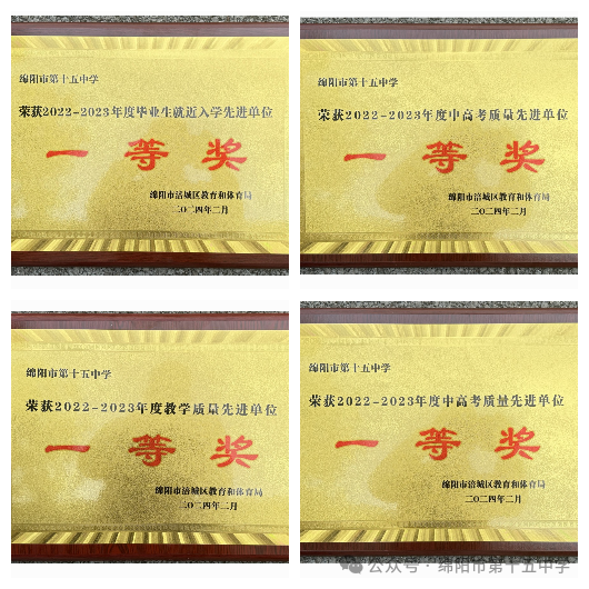 2024年2月19日,涪城區(qū)召開了2024年推進(jìn)義務(wù)教育教學(xué)改革實(shí)驗(yàn)區(qū)建設(shè)工作會(huì),會(huì)上,表揚(yáng)了2022-2023年度教育教學(xué)先進(jìn)單位和先進(jìn)個(gè)人,綿陽市第十五中學(xué)榮獲2022-2023年度“綜合績效考核先進(jìn)單位一等獎(jiǎng)”“中高考質(zhì)量先進(jìn)單位一等獎(jiǎng)”“教學(xué)質(zhì)量先進(jìn)單位一等獎(jiǎng)”“畢業(yè)生就近入學(xué)先進(jìn)單位一等獎(jiǎng)”殊榮。