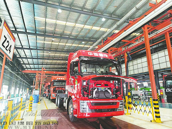 在中國重汽集團綿陽基地車間里,裝配線上正在進行駕駛室落裝程序