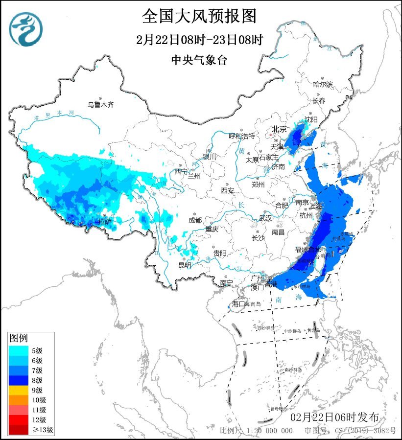 預計,2月22日08時至23日08時,西藏中西部、青海西南部、遼東半島、云南東部等地的部分地區(qū)有5~6級大風,陣風7~8級;渤海、渤海海峽、黃海西部海域、東海西部海域、臺灣海峽、臺灣以東洋面、南海東北部將有7-8級、陣風9級的偏北到東北風。
