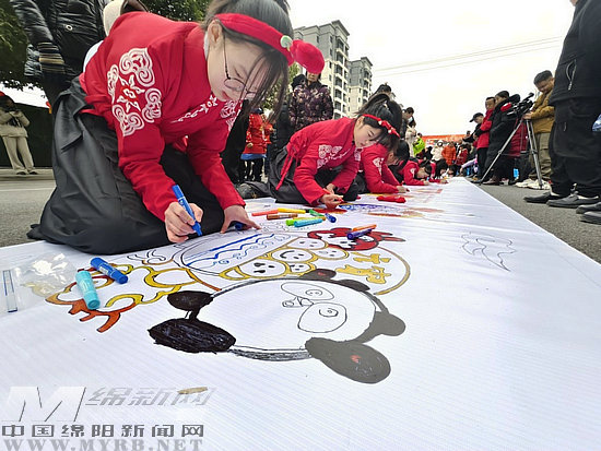 大紅燈籠、可愛的湯圓寶寶、威武雄壯的巨龍、炫彩斑斕的煙花……活動現場,長長的畫卷平鋪開來,來自界牌小學的33名孩子們身著漢服,正用小手繪制長卷表達對節(jié)日的祝福,對家鄉(xiāng)的熱愛。