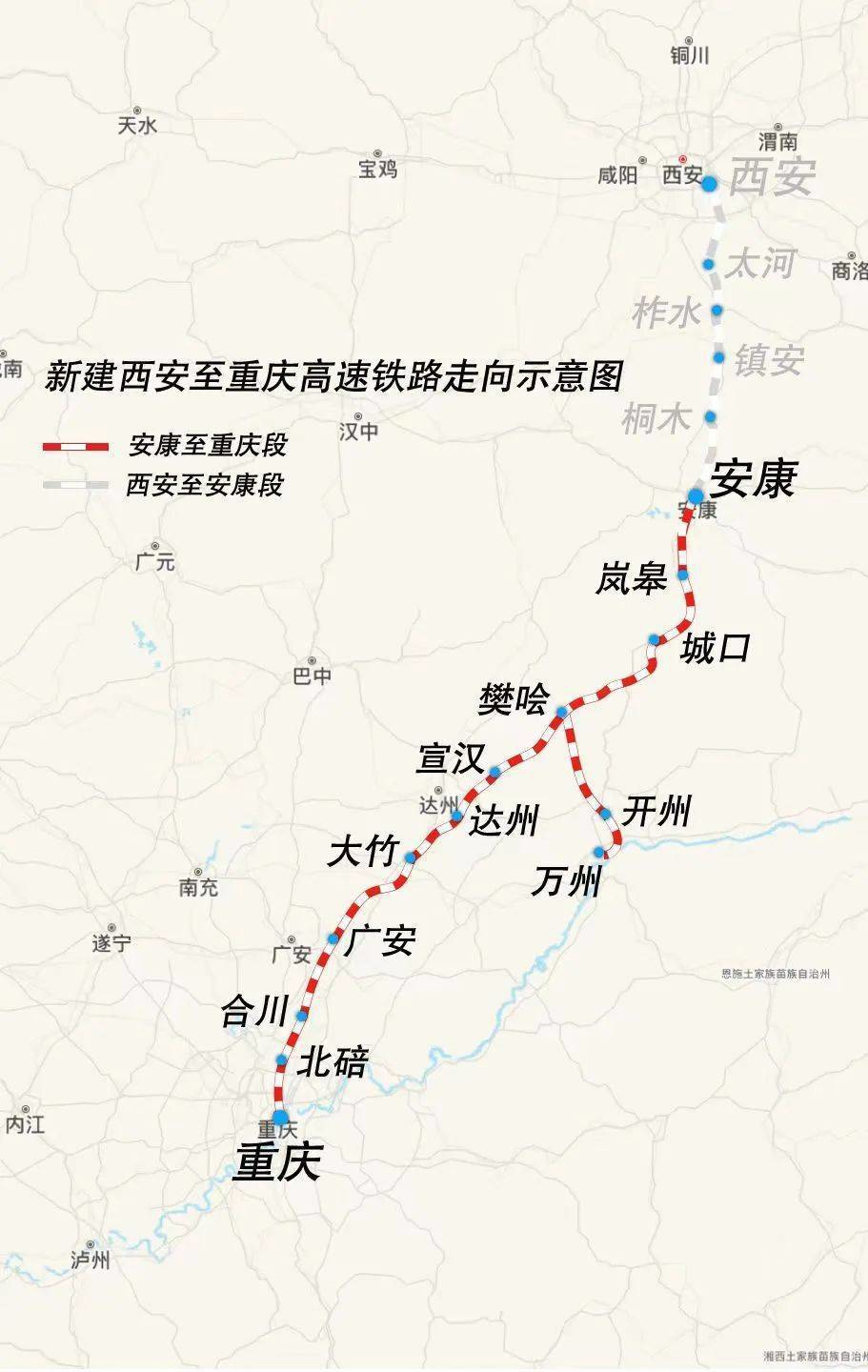 據(jù)悉,西渝高鐵康渝段自安康西站起,經(jīng)陜西省安康市,重慶市城口縣,四川省達(dá)州市、廣安市,重慶市合川區(qū)、北碚區(qū),引入重慶樞紐重慶西站,共設(shè)安康西、嵐皋、城口、樊噲、宣漢南、達(dá)州南、大竹、廣安東、合川東、北碚南、重慶西11座車站,其中重慶西為既有車站,其他為新建車站。