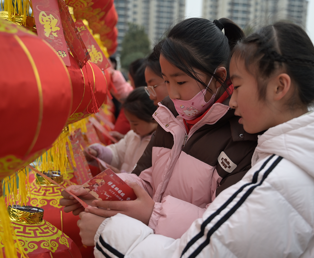 中國紅、龍?jiān)?、漢服飾、非遺文化,共同營造出國風(fēng)濃郁、喜慶歡樂的校園迎新氛圍。萌萌的“小龍人”、腳踩高蹺的“氣球人”……熱情地和孩子們打著招呼,送著祝福。操場上,“魚躍龍門”“祥龍獻(xiàn)瑞”“龍行大運(yùn)”“畫龍點(diǎn)睛”……一個(gè)個(gè)寓意美好、年味兒十足的趣味游園活動(dòng),讓孩子們興趣盎然。寫“福”字,猜燈謎,制作一個(gè)湯圓“表情包”,蒙上眼睛給龍貼眼睛……快樂的歡呼聲、助威聲此起彼伏,響徹校園。糖葫蘆、棉花糖、藝術(shù)氣球、糖畫的攤位旁更是人頭攢動(dòng),擠滿了來兌換獎(jiǎng)品的孩子們。非遺匠人們靈動(dòng)的手指上下飛舞,左右穿梭,頃刻間,一條糖做的“龍”、一串冰糖葫蘆、一頂氣球捏成的帽子……神奇地握在了孩子們的手中,驚嘆的眼神后,“耶”的呼喊聲便從這里響起。