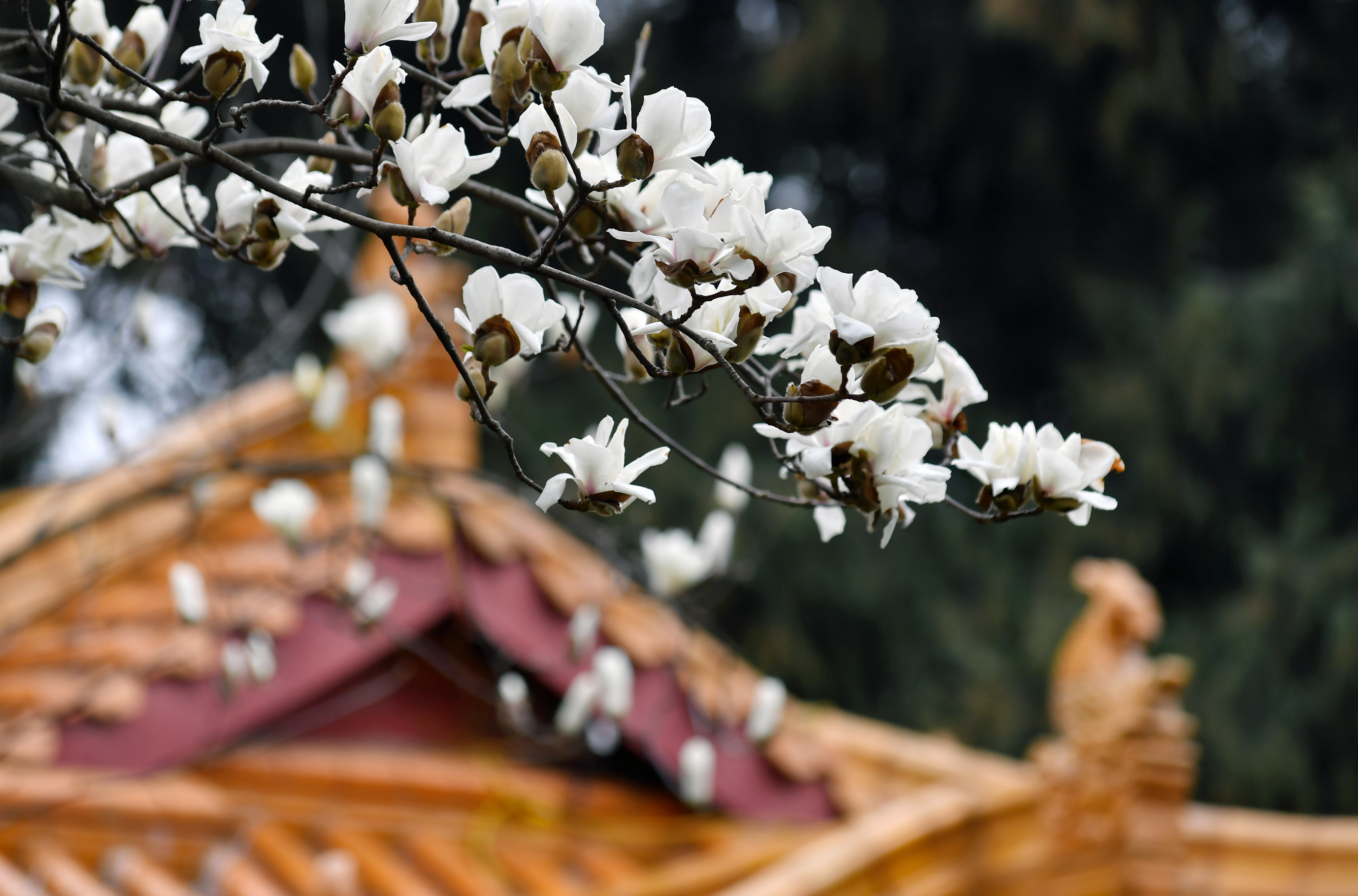 在富樂山,一朵朵潔白碩大的玉蘭花與古香古色的紅墻黃瓦、飛檐脊獸相互映襯,呈現(xiàn)出一幅韻味十足的詩意美景圖,吸引了許多市民觀賞和拍照。