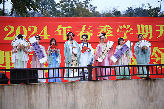開學(xué)典禮在學(xué)生《龍的傳人》的武舞表演中拉開了序幕。在莊嚴(yán)的升旗儀式結(jié)束之后,由學(xué)生代表帶領(lǐng)全體學(xué)生齊唱了校歌、齊誦了校訓(xùn)。師生代表的“漢服走秀送祝?;顒?rdquo;展示了中華文化中的服飾之美、語言之美、文化之美。四位級部主任帶領(lǐng)各級部師生一起誦讀了帶有“龍”字的經(jīng)典詩文,讓全校師生再次領(lǐng)略了中華經(jīng)典之美,中國文化之美。