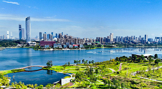 2023年5月12日,環(huán)興隆湖畔,成都超算中心、成都科創(chuàng)生態(tài)島等錯(cuò)落有致,一幅山水人城和諧相融的大美公園城市畫卷,正在這里徐徐鋪展。新華社發(fā)(四川省委宣傳部提供)。