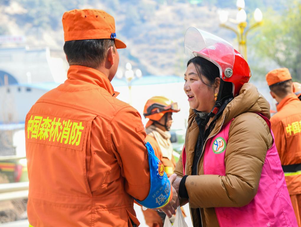 3月18日,在四川省甘孜藏族自治州雅江縣,四川省森林消防總隊的消防員感謝彭三妹(前右)送來饃饃。