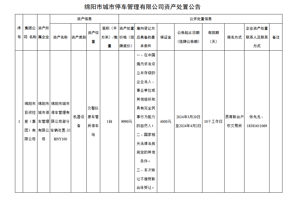 綿陽市城市停車管理有限公司資產(chǎn)處置公告